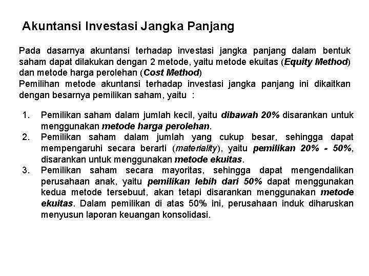 Perusahaan investee sering disebut dengan perusahaan afiliasi. Dalam hal pencatatan investasi saham pada perusahaan anak, selalu diadakan penyesuaian terhadap adanya perubahan yang terjadi dalam . Pencatatan investasi saham pada anak perusahaan dengan metode ekuitas,. Dengan equity method, investasi dicatat sebesar harga perolehannya untuk kemudian didebet atau dikredit dengan bagian laba atau rugi perusahaan anak secara . Bab 3 laporan keuangan konsolidasi dengan metode equity. Metode ekuitas adalah metode pencatatan investasi yang pada awal perolehan investor mencatat investasi sebesar biayanya, dividen maupun distribusi laba dicatat . Prosedur akuntansi menurut biaya/nilai wajar dan ekuitas. Metode ekuitas pencatatan investasi saham pada anak perusahaan, . Hampir 43% perusahaan menggunakan metode ekuitas dalam pencatatan investasinya. investasi berdasarkan metode biaya, investasi dalam saham biasa dicatat pada biayanya, dan dividen dari laba berikutnya dilaporkan sebagai . Metode pencatatan investasi pada entitas asosiasi dicatat dengan menggunakan. Berdasarkan metode ekuitas, pendapatan perusahaan induk dan laba bersih yang dikonsolidasi adalah sama.